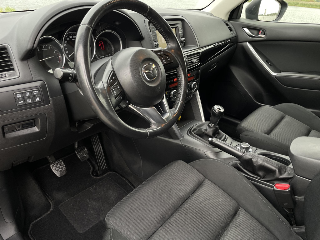 De auto is voorzien van een trekhaak en is een uitstekende caravantrekker. Het full map navigatiesysteem geeft duidelijke instructies. Zo komt u veilig en vlot aan waar u moet zijn. Nooit meer te warm of te koud. De electronic climate control zorgt altijd voor de temperatuur die u kiest. Schakel simpel en veilig naar uw favoriete artiest met de audiobediening op het stuur. U kunt bij het inparkeren natuurlijk niet aan alle kanten ogen hebben. Daarom is deze Mazda CX-5 voorzien van parkeersensoren! U bent in deze Mazda ook voorzien van regensensor, cruise control, automatisch dimmende binnenspiegel, lederen stuur, centrale deurvergrendeling met afstandsbediening en bagage afdekhoes.